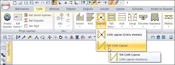 Tek Çelik Çapraz komutu ile kirişler, kolonlar veya makaslar arasına tek çelik çapraz çizilir. Çelik çaprazlar düşey ve yatay stabilite elemanlarıdır.