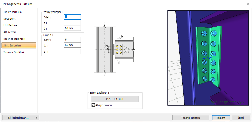 Grup 1 ![]() Kiriş bulonları ayarları (satır sayısı, uzaklık değerleri..) girilir. Girilecek değerler şematik çizimde gösterilmektedir. |