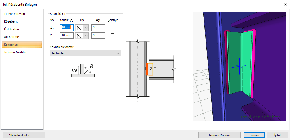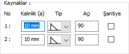 Kaynaklar ![]() Birleşim yerlerine yapılacak kaynakların kalınlık, tip ve açı değerleri verilir. Şantiyede yapılıp yapılmayacağı bilgisi girilir. |