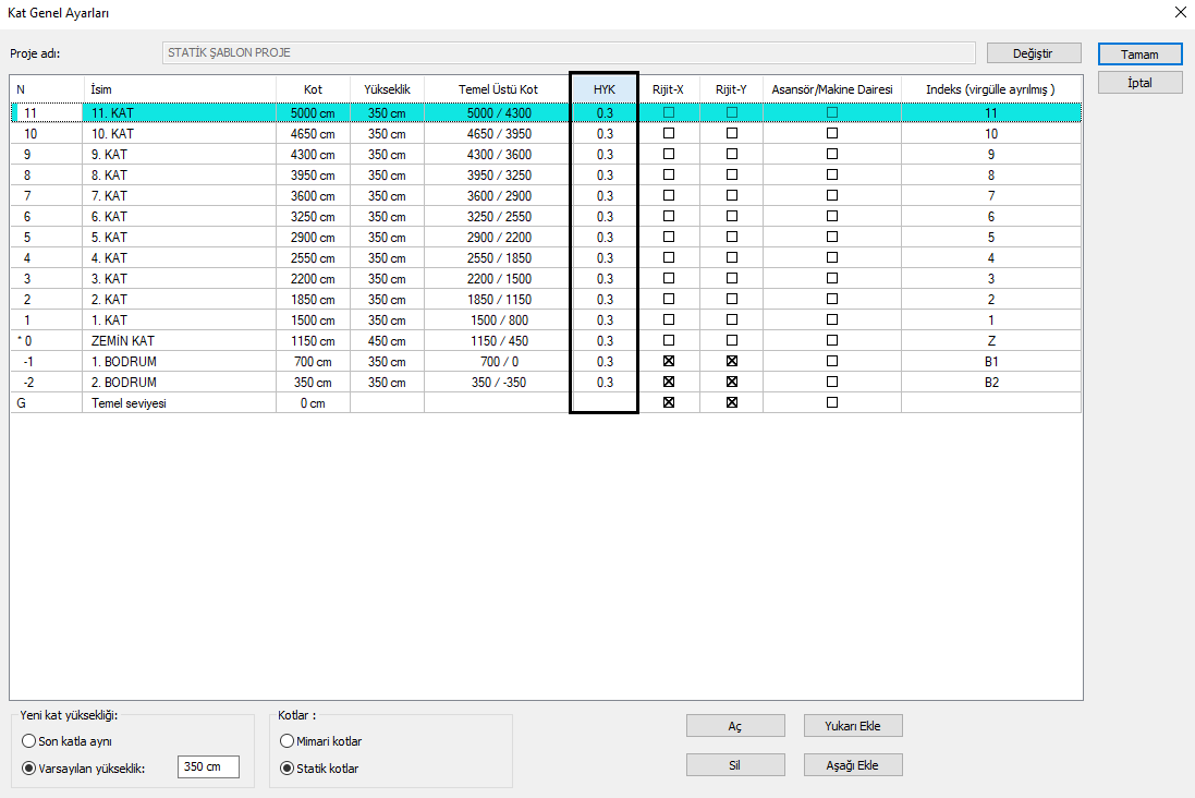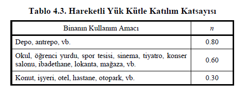 - Denklem 4.16 ile yapılan hesaplarda Tablo 4.3 Hareketli Yük Kütle Katılım Katsayısı kullanıcı denetimindedir. Kat genel ayarları HYK bölümünden gerekli düzenleme yapılabilir.