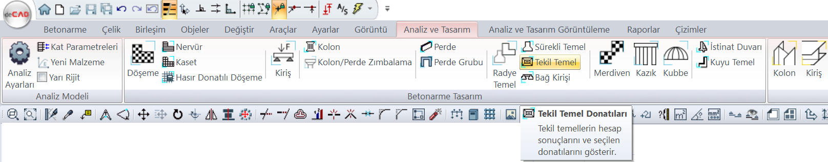 Analizden sonra, ribbon menü Analiz ve Tasarım sekmesi Betonarme Tasarım başlığı altından Tekil Temel Donatıları komutuna tıklayarak ulaşabilirsiniz.