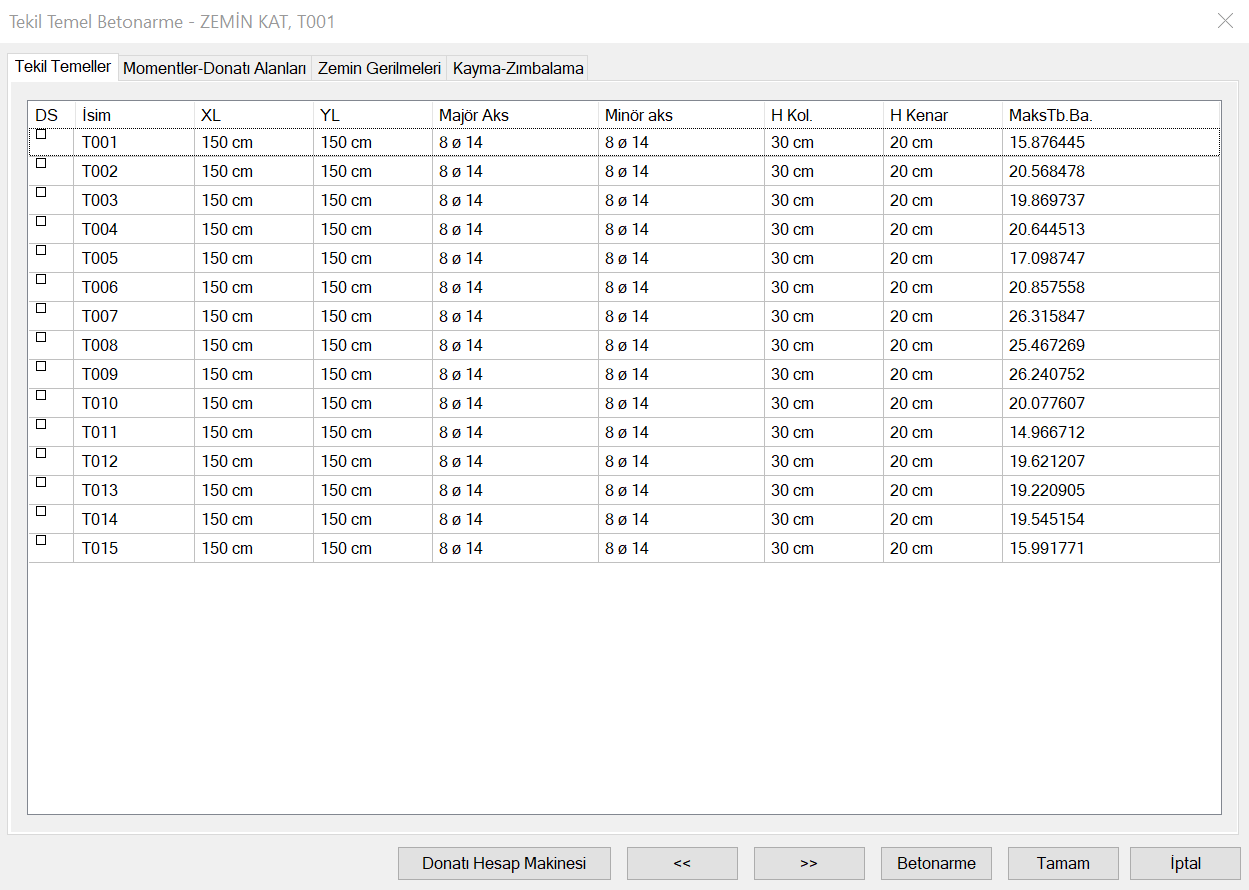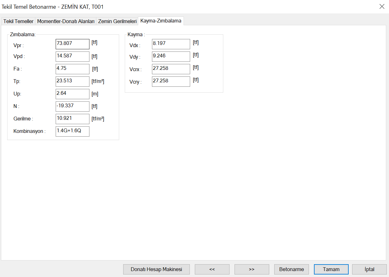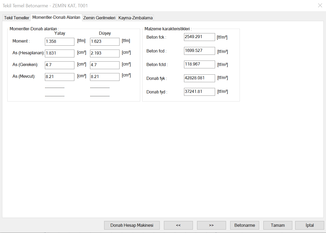 Tekil temel betonarme tasarım sonuçları ve tekil temellere ilişkin yetersizlik durumları Tekil Temel Betonarme diyaloğunda gösterilir. Tekil Temel Betonarme diyaloğunda temel donatıları, zemin gerilmeleri ve kayma-zımbalama sonuçları verilir.