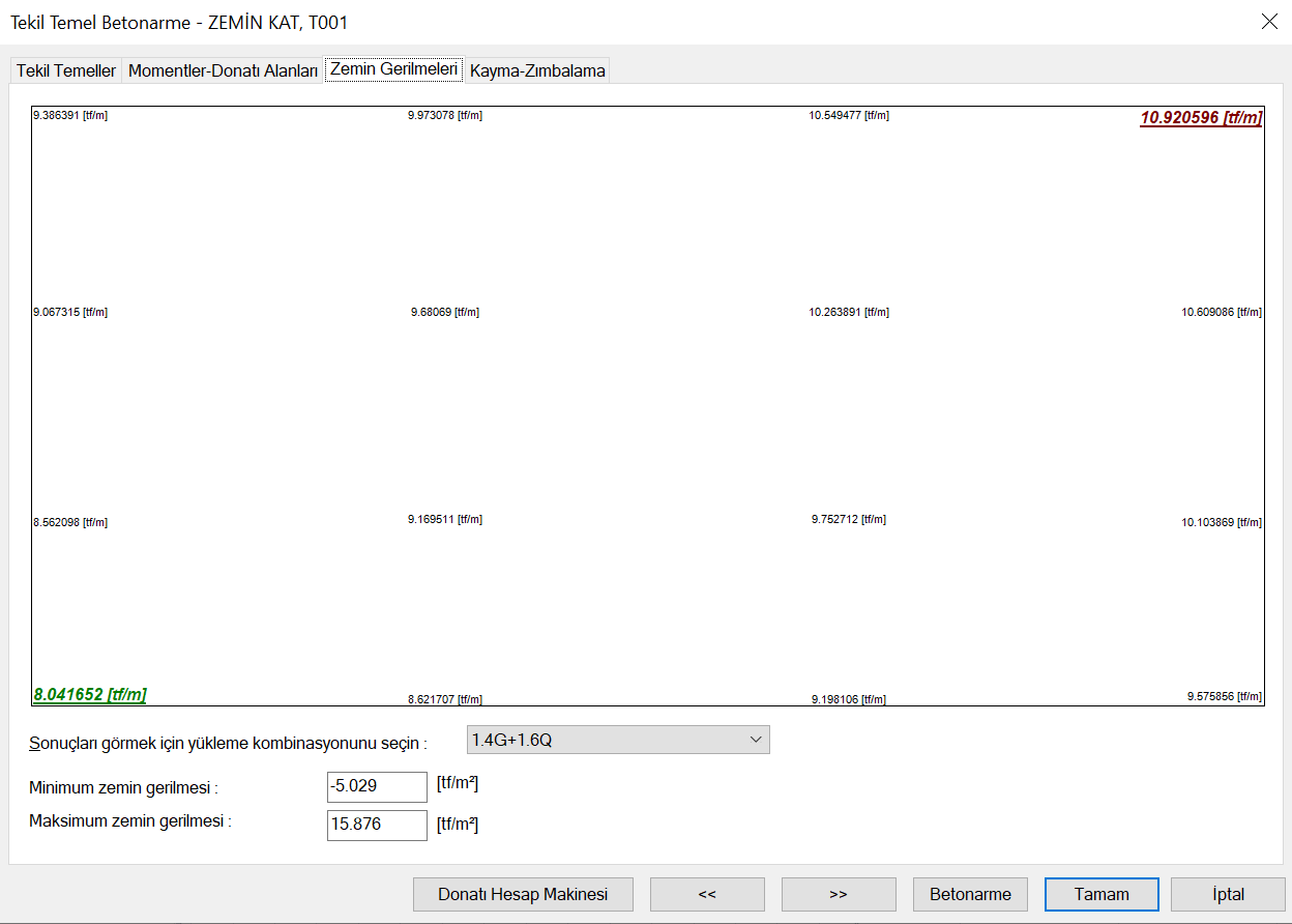 Yükleme kombinasyonunun seçimine göre maksimum gerilmeden minimum gerilmeye kadar, bütün gerilme değerleri listelenir. Bazı durumlarda tekil temelde kolon ortasında zemin gerilmesi daha büyük çıkabilir. Bu durumda alt kısımda verilen maksimum zemin gerilmesi değerin burada göremeyebilirsiniz.