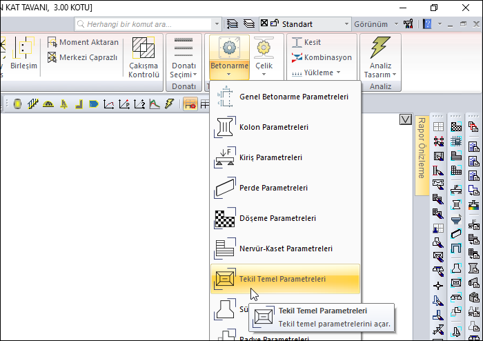 Tekil Temel Parametreleri komutu ile Betonarme Tekil Temel Tasarımında kullanılan tasarım parametreleri belirlenir. Paspayı, maksimum ve minimum donatı oranı vb. parametreler tekil temel parametreleri penceresinden belirlenir.