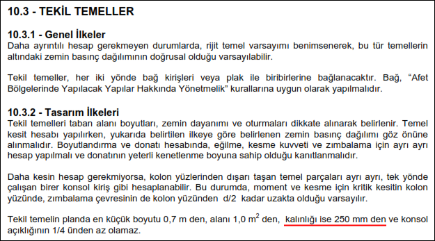 Tekil temel kalınlığı 25cm'den az olamaz. (T.S.500 10.3.2)