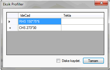 Aktarma dosyası seçildikten sonra eğer Tekla için eksik profil bulunursa program sizden ideCAD'de kullanılan profillerin karşılığında Tekla'da hangi profillerin kullanılacağını seçmenizi ister.