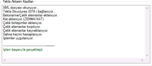 Tekla aktarım kayıtları ![]() Aktarım işlem bilgisi verilir. |