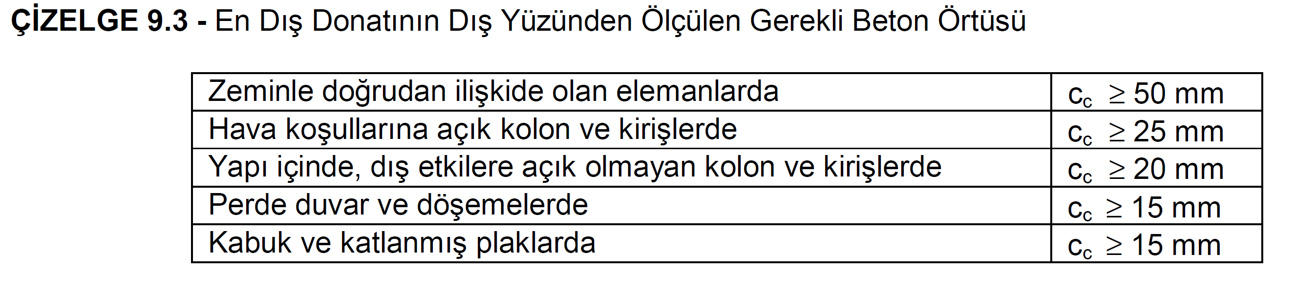 Beton örtüsü kontrolü uygulanırken TS 500 Madde 9.5.1 'de verilen Çizelde 9.3 gözönüne alınır. Bu nedenle sürekli temellerde net beton örtüsü cc ≥ 50 mm olmalıdır.