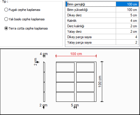 Terra cotta dış cephe kaplamasının birim boyutları düzenlenerek farklı görünüşler elde edilir. Dış cephe kaplaması ayarları diyaloğunda bulunan tabloda, birim elemanının boyutları belirir. Boyutlar verilirken, girilen boyutlara göre şeklin değişimi altta ön görüntüden takip edilir. Tıklanan boyut satırı ön izlemede kırmızı renkli olarak gösterilir.