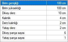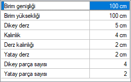 Birim genişliği Birim parçanın genişliği girilir. Her birim dış cephe kaplamasının tamamını üst üste ve yan yana gelerek oluşturur. |