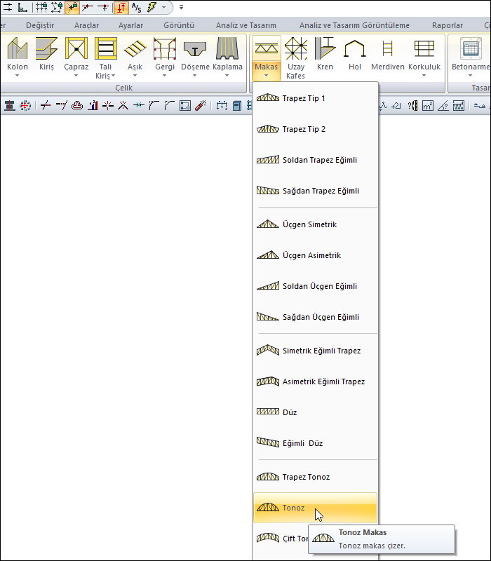 Tonoz komutuyla, hazır makas tiplerinden biri olan tonoz makas tipi hızlı bir şekilde çizilir. Makas ayarlarından makas yükseklikleri ayarlanır.
