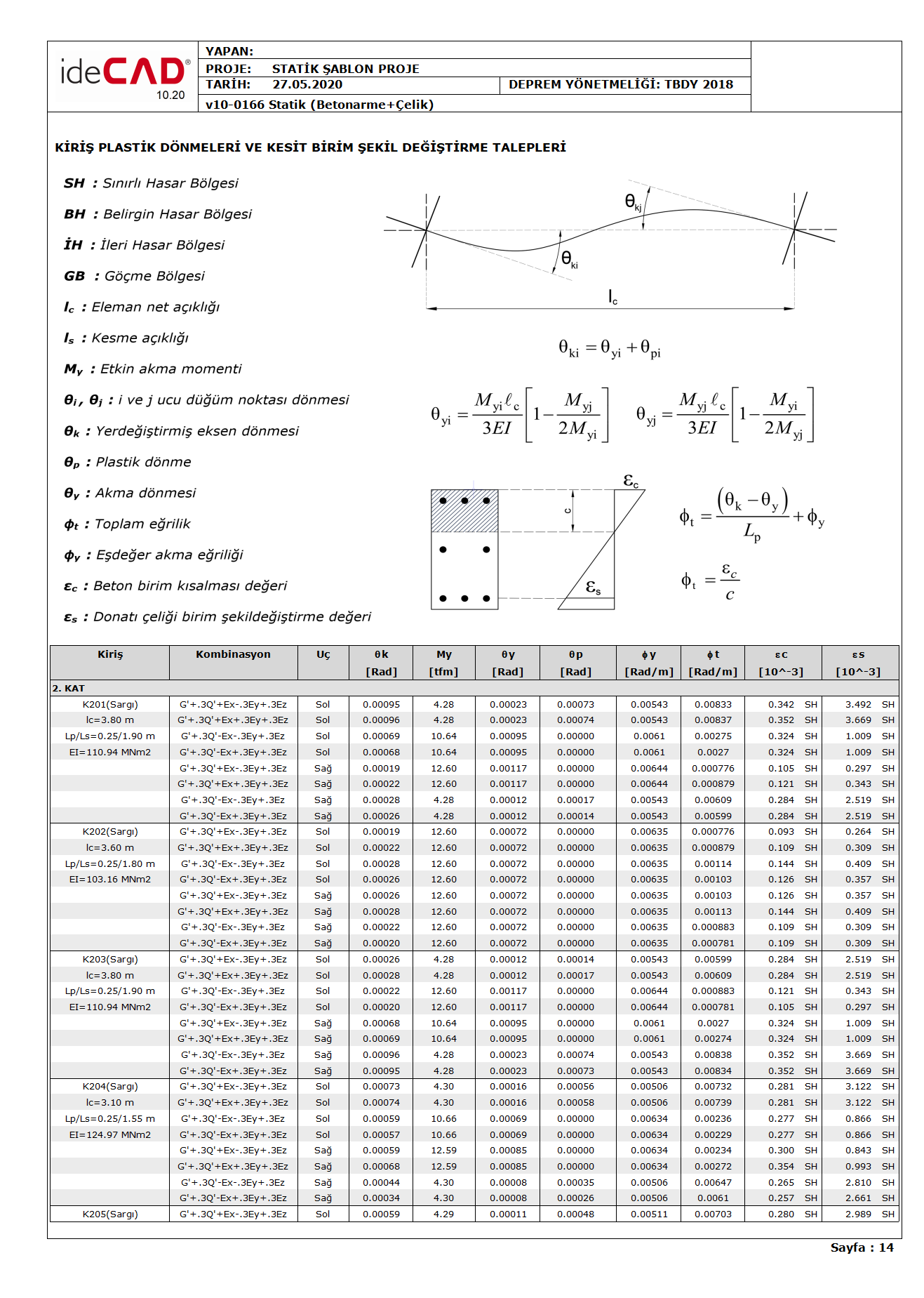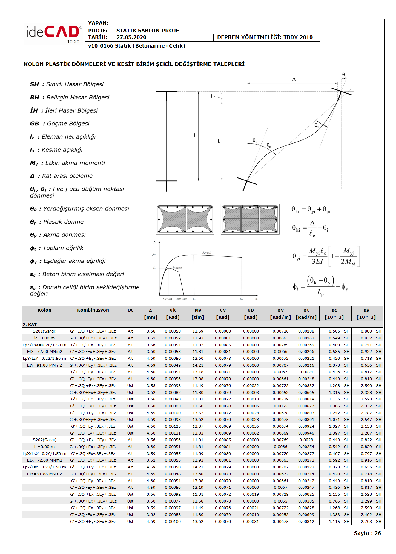 Aşağıdaki rapor örneğinde kolonlar için toplam eğrilik talebi ϕt , akma dönmesi θy , akma momenti My , plastik dönme talebi θp , akma eğriliği ϕy , toplam eğrilik talebi ϕt gösterilmiştir.