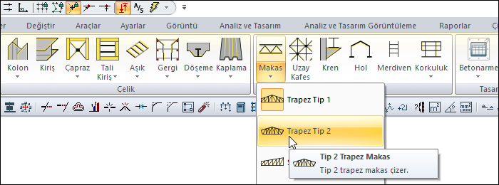 Trapez Tip 2 komutuyla, hazır makas tiplerinden biri olan trapez makas tipi hızlı bir şekilde çizilir. Makas ayarlarından makas yükseklikleri ayarlanır.