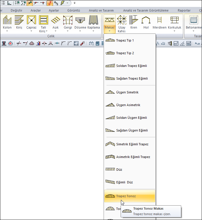 Trapez Tonoz komutuyla, hazır makas tiplerinden biri olan trapez tonoz makas tipi hızlı bir şekilde çizilir. Makas ayarlarından makas yükseklikleri ayarlanır.