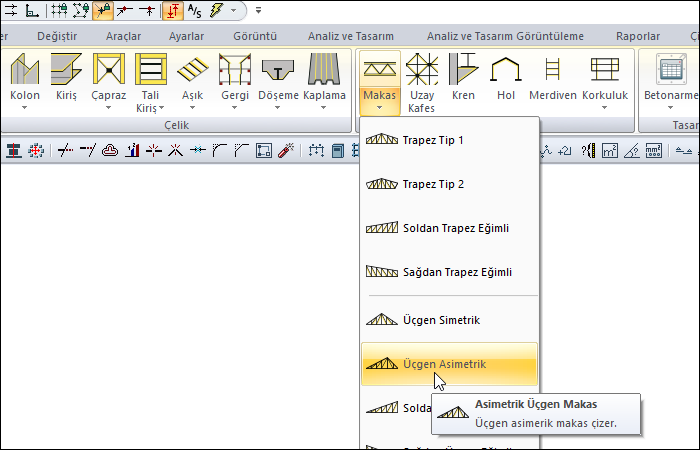 Üçgen Asimetrik komutuyla, hazır makas tiplerinden biri olan üçgen asimetrik makas tipi hızlı bir şekilde çizilir. Makas ayarlarından makas yükseklikleri ayarlanır.