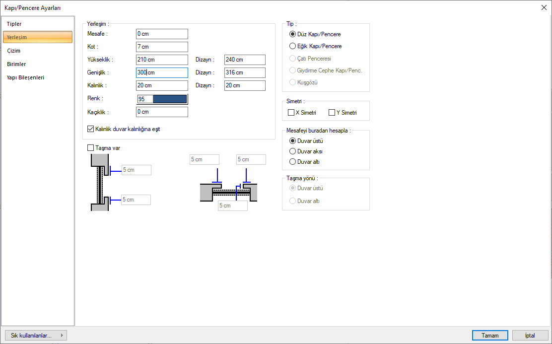 Kapı/pencere toolbarında Uzaklık kullan seçeneğini işaretleyin ve değer kutusuna 0 girin.
