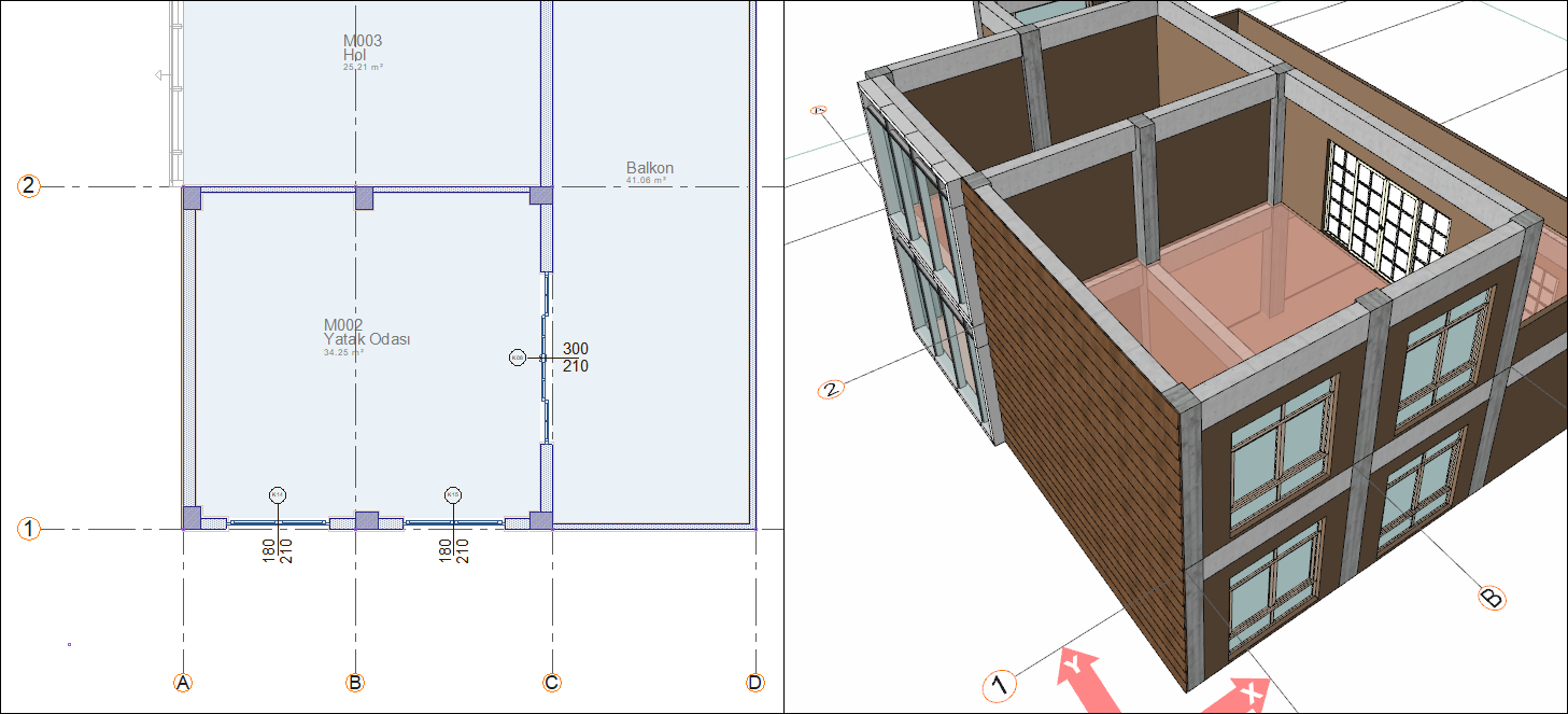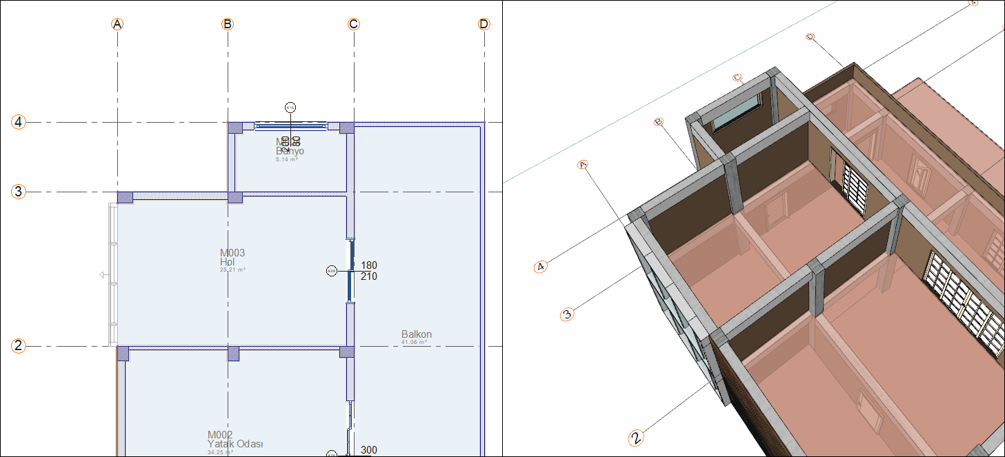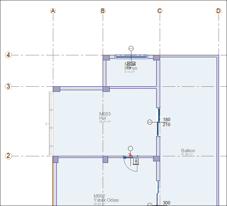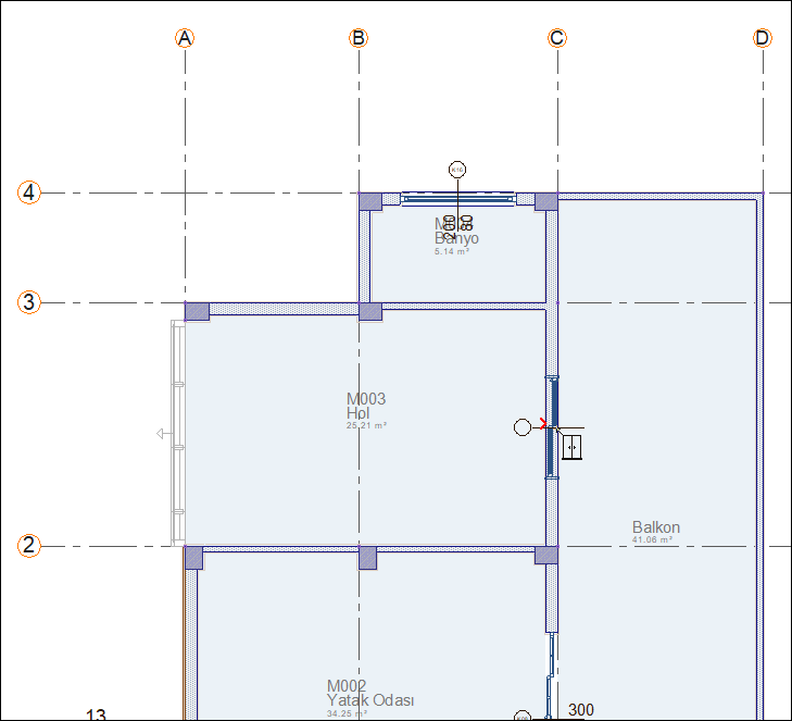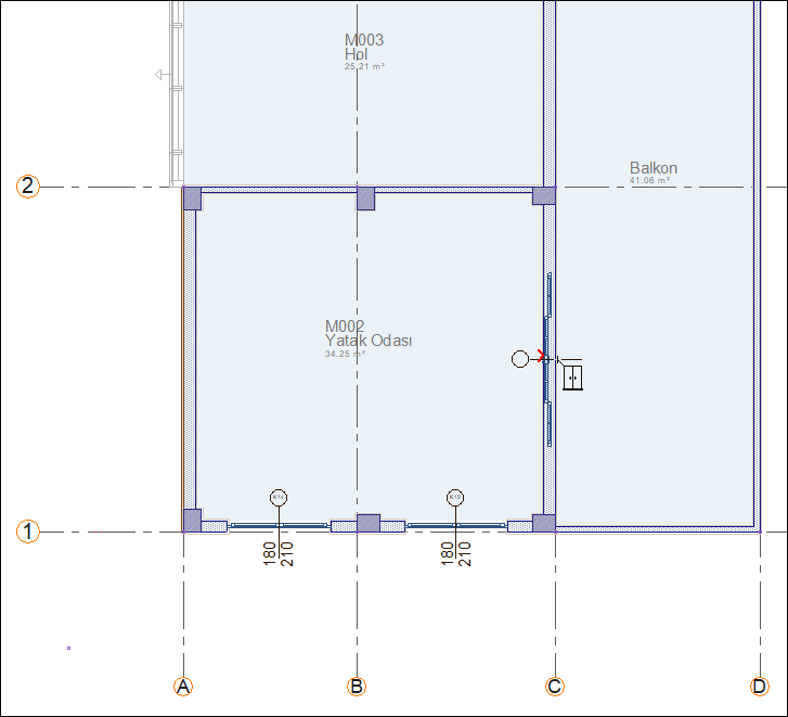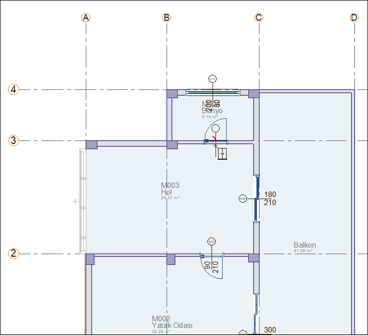 Farenizi 3 aksı üzerinde B ve C aksları ile sınırlandırılmış duvarın ortasına götürün.