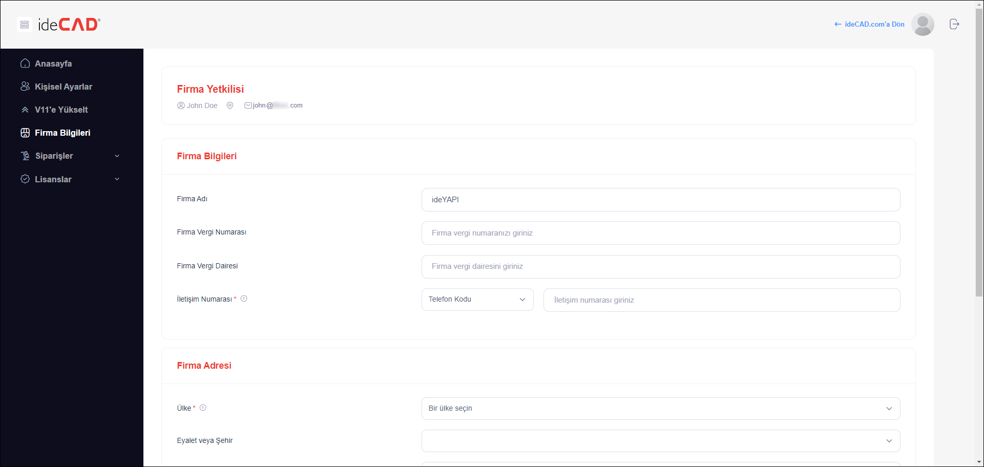 MyAccount sayfasına ideYAPI OneClick üzerinden de ulaşılır. Kişisel bilgiler, varsa firma bilgileri düzenlenir, yükseltme işlemleri yapılıp, sipariş ve lisanslar görüntülenir.