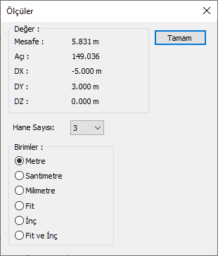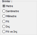 Birimler ![]() Verilen değerlerin ölçü birimini ayarlar. Metre: İşaretlenirse, bilgi yazısının birimi metre olur. |