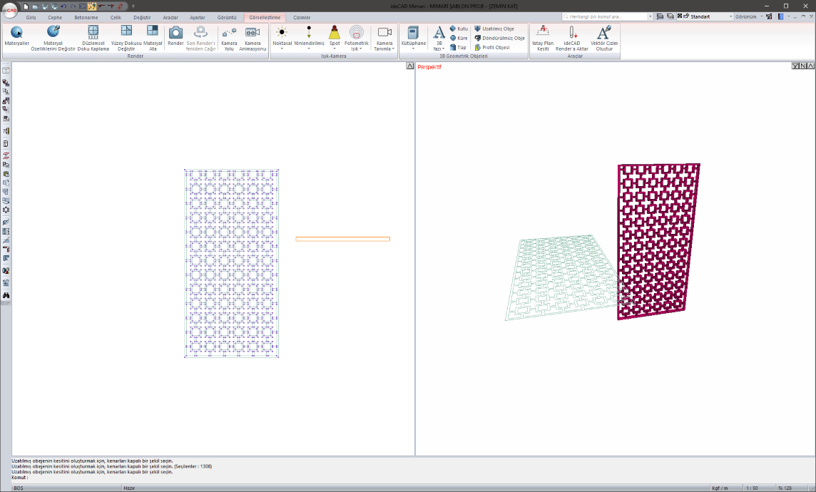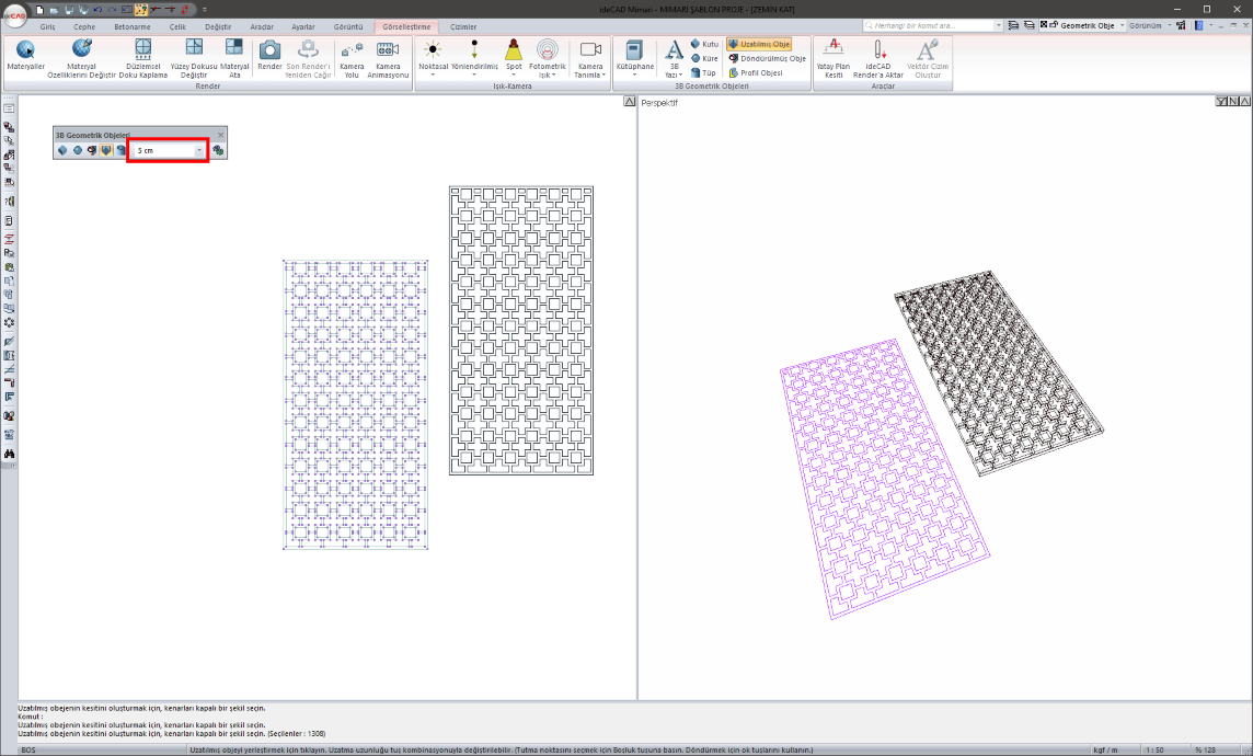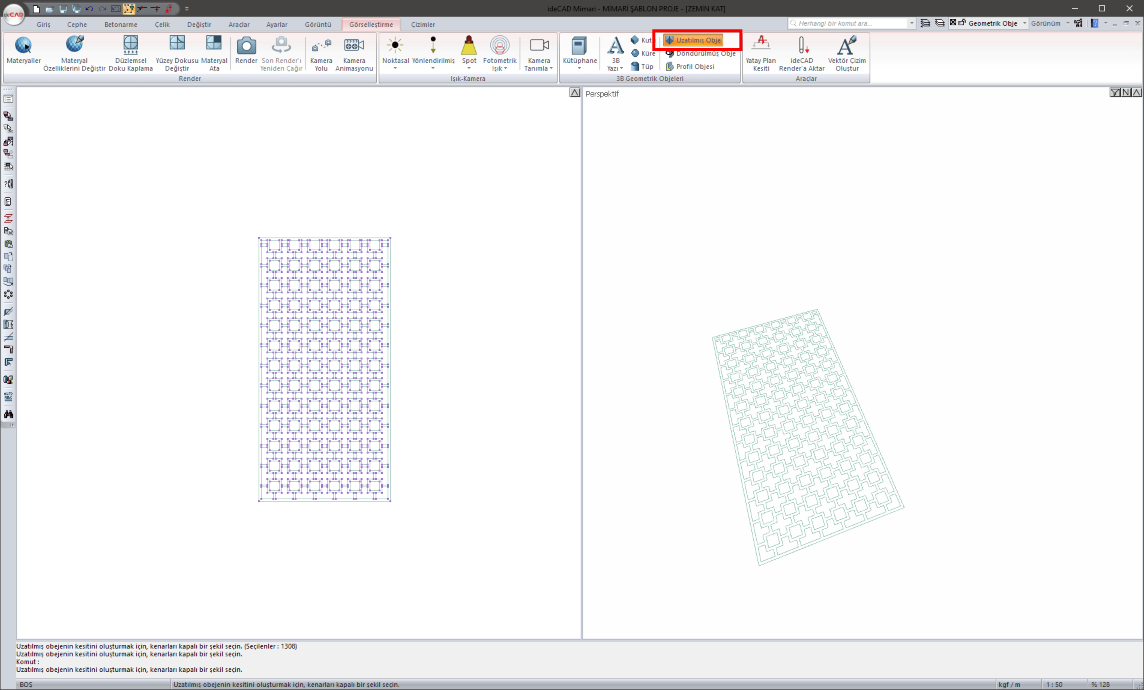 "Uzatılmış obje" komutu ile plan düzleminde oluşturulan objeler 3 boyutlu hale dönüştürülür.