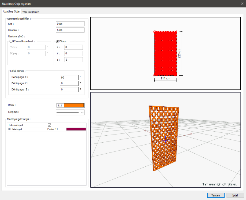 Oluşan objenizi seçip ayarlarına girerek istediğiniz kot, kalınlık ve dönüş açısı ayarlarını yapabilirsiniz.