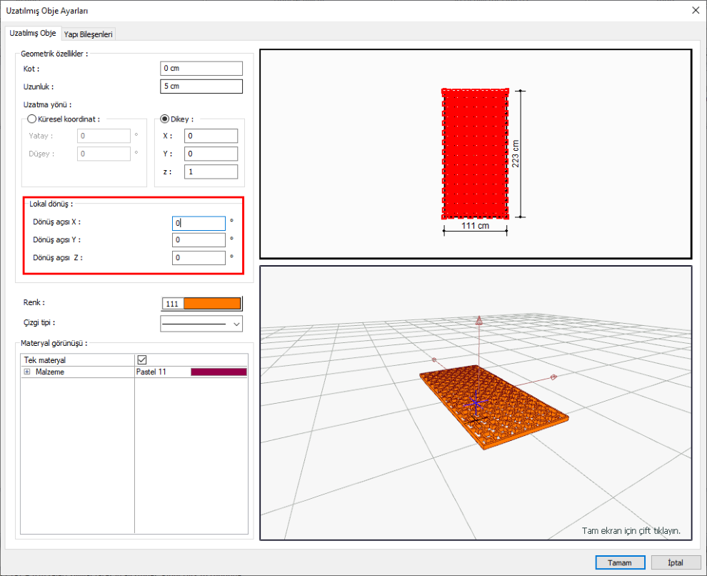 Uzatılmış obje ayarları diyaloğundan lokal dönüş özelliğine ulaşabilirsiniz.