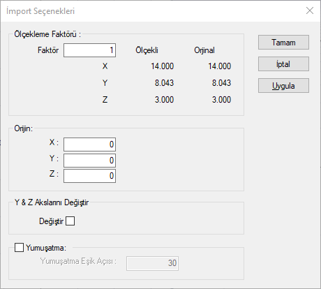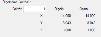 Ölçekleme faktörü![]() Import edilen dosyanın orijinal x, y, z düzlemindeki boyutları görünür. Girilen faktör değerine göre x, y, z düzlemindeki boyutları değişir ve ölçekli altında gösterilir. |