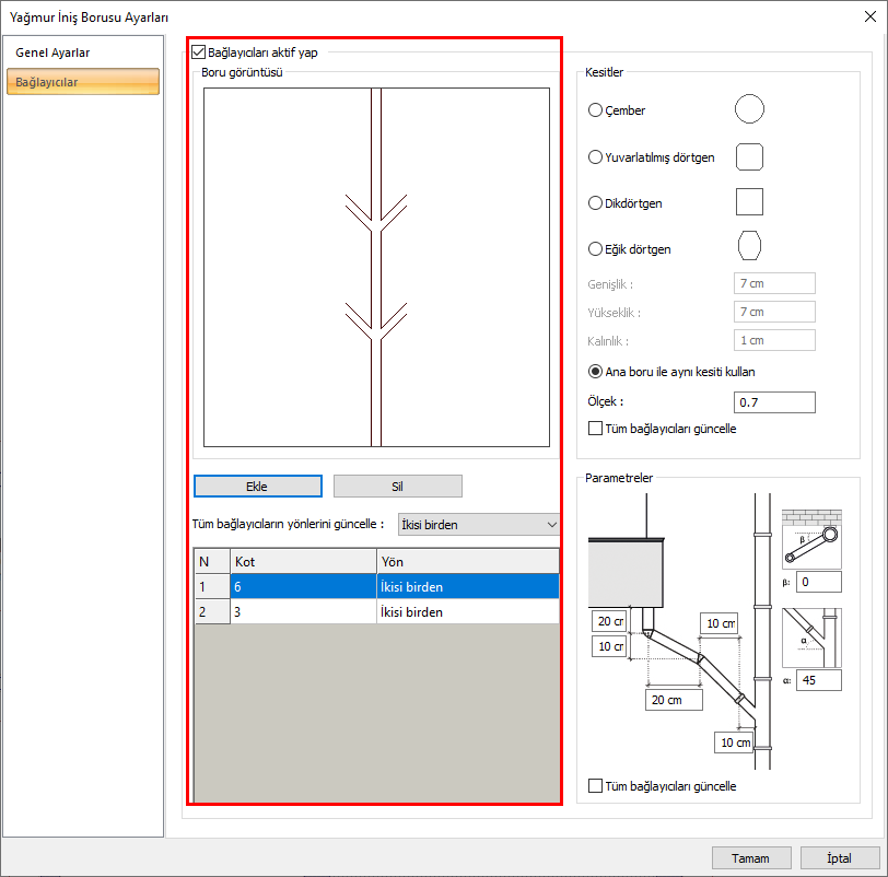 Yağmur iniş borusu ayarları diyaloğu bağlayıcılar sekmesinden bağlayıcıları aktif yap özelliğini işaretleyin.