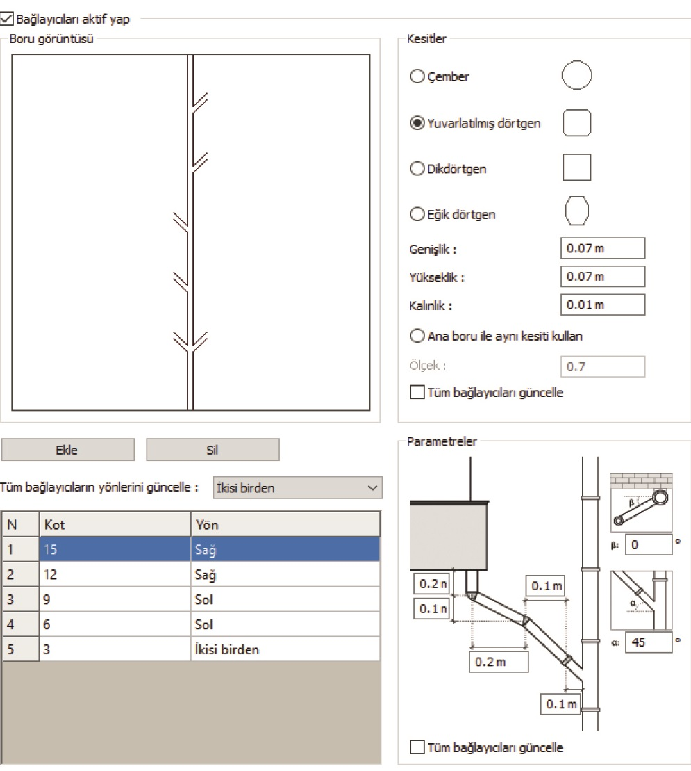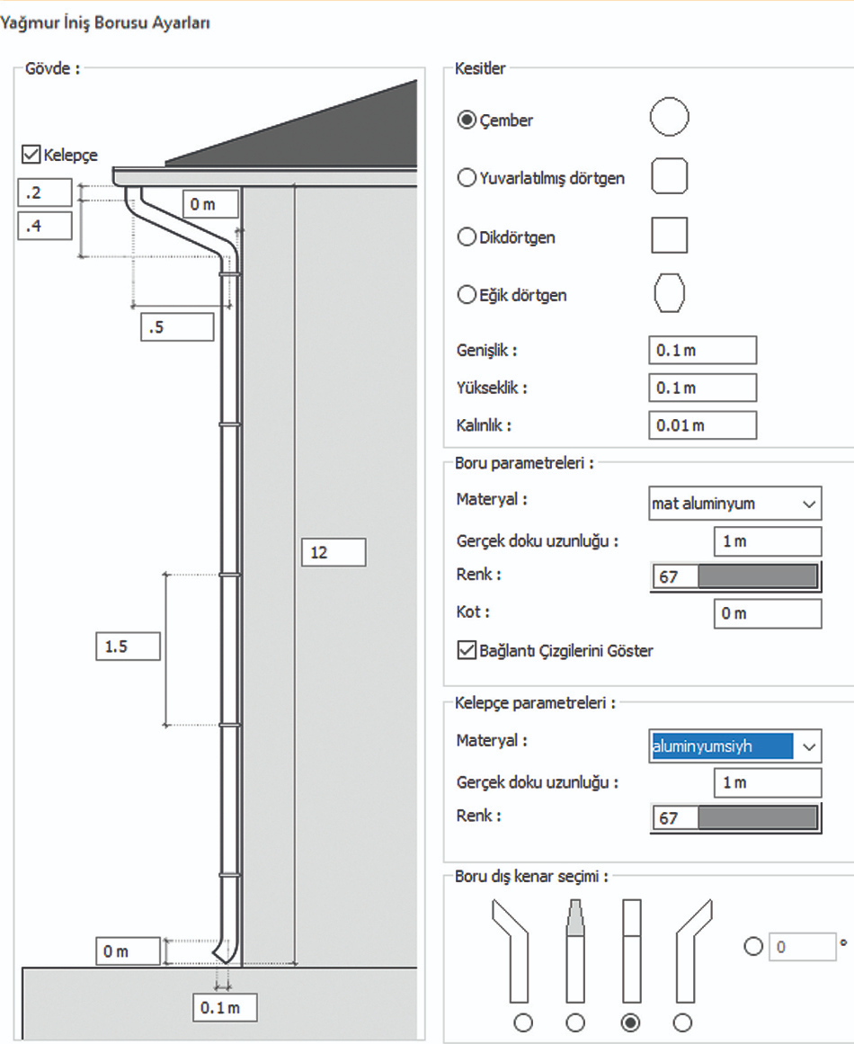 Yağmur iniş borusu ayarlarından, gövde, kelepçe, bağlayıcı gibi elemanların kesit, materyal ve boyut ayarları yapılır.