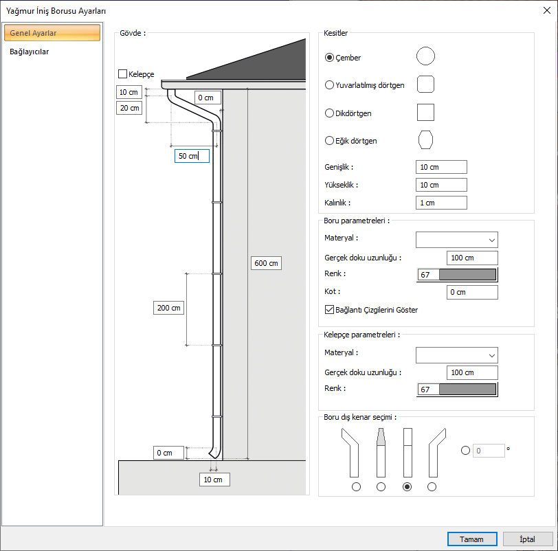 Yağmur iniş borusu toolbarında ayarlar ikonuna tıklayın. Yağmur iniş borusu ayarları diyaloğu açılacaktır.