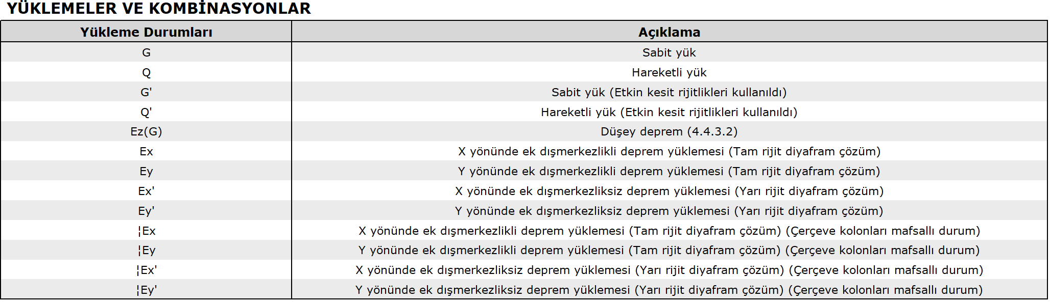 Seçmeli raporda yükleme durumları ve yükleme kombinasyonları alt başlığında da bilgi yer almaktadır.