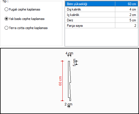 Yalı baskı dış cephe kaplamasının birim boyutları düzenlenerek farklı görünüşler elde edilir. Dış cephe kaplaması ayarları diyaloğunda bulunan tabloda, birim elemanının boyutları belirir. Boyutlar verilirken, girilen boyutlara göre şeklin değişimi altta ön görüntüden takip edilir. Tıklanan boyut satırı ön izlemede kırmızı renkli olarak gösterilir.