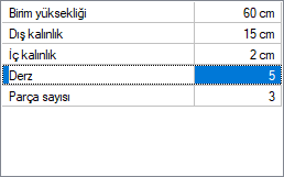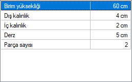 Birim yüksekliği Birim parçanın yüksekliği girilir. Her birim dış cephe kaplamasının tamamını üst üste ve yan yana gelerek oluşturur. |