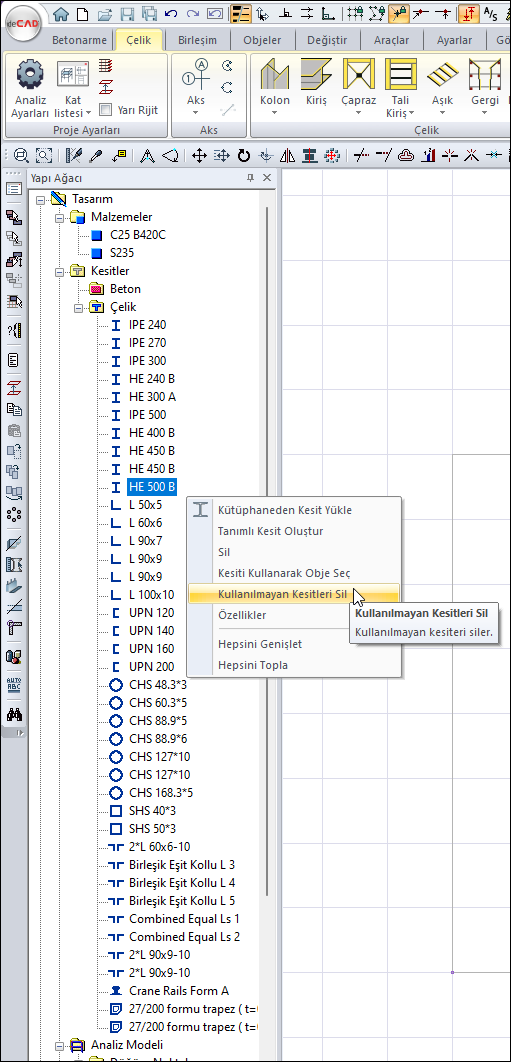 Proje de kullanılmayan çelik kesitler Kullanılmayan Kesitleri Sil komutu ile tek seferde silinir.