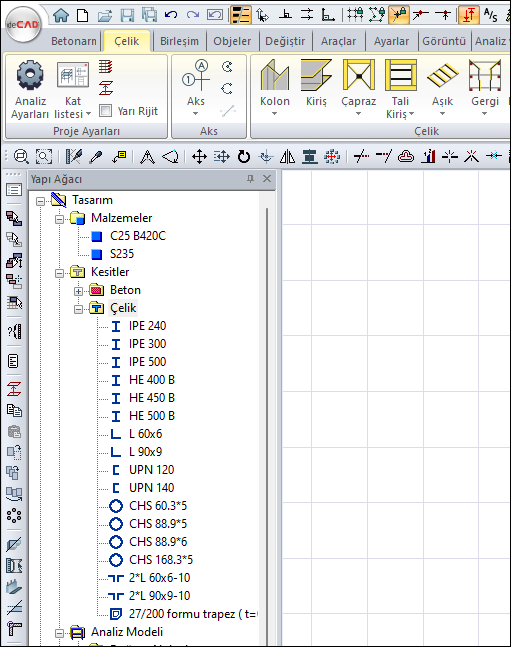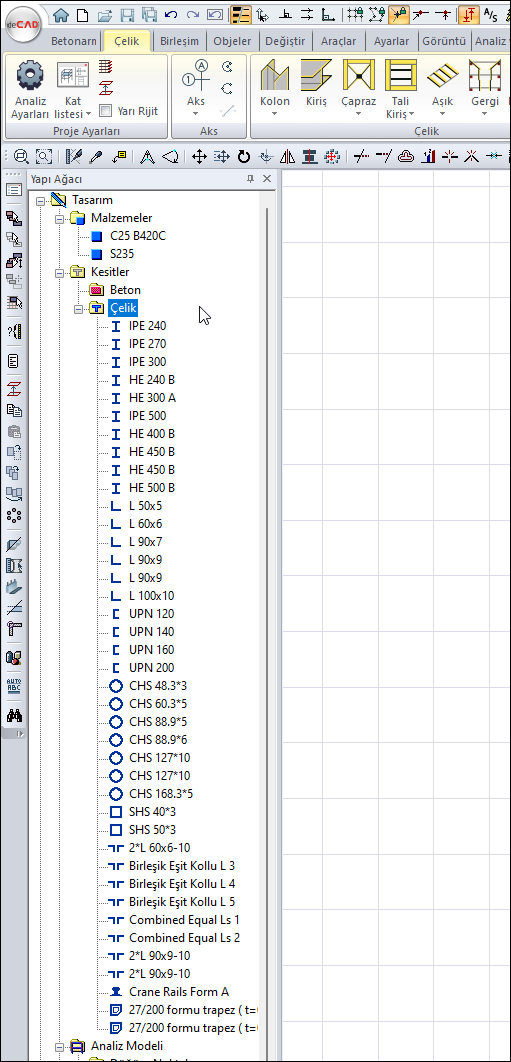Yapı ağacında sadece projede kullanılan çelik kesitler kalıcaktır.