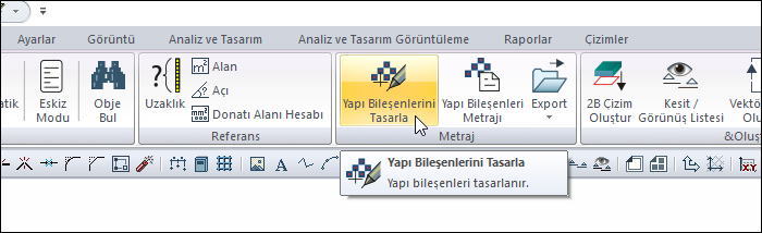 Yapı Bileşeni Tasarla komutuyla oluşturduğunu yeni yapı bileşenlerinizi daha sonra kullanabilmek için arşive kaydedebilir, kaydedilmiş yapı bileşenlerini projeye yükleyerek tekrar kullanabilirsiniz.