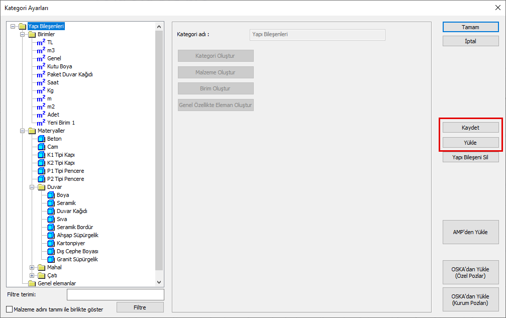 Kaydet ve yükle komutlarına Yapı Bileşeni Tasarla ikonuna tıkladığınızda açılan Kategori Ayarları diyaloğundan ulaşabilirsiniz.