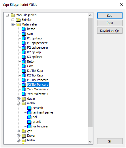 Seç ![]() Listeden seçilen yapı bileşenini projeye yükler. |