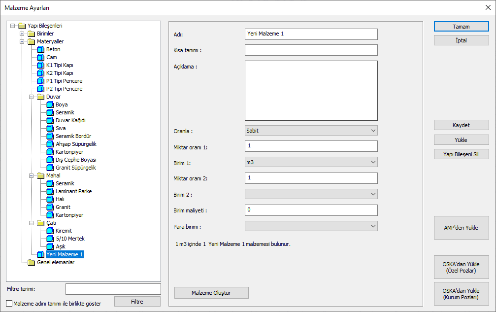 Diyaloğun sağ tarafında yeni malzemeye ait bilgi ve özelliklerin bulunduğu değiştirilebilir satırlar yer alacaktır.