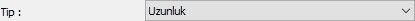 Tip ![]() Birim olarak tanımladığımız bileşenin hangi birimi temsil ettiğini belirler. Listeden boy, alan, hacim, kütle, zaman, enerji, sayı seçeneklerinden biri seçilir. Tip listesinde bulunan büyüklüklerin default birimleri şunlardır: Boy -> Metre Alan -> Metrekare Hacim -> Metreküp Kütle -> Kilogram Zaman -> Dakika Enerji -> Jul Para birimi, sayı ve genel büyüklüklerinin default birimleri bulunmamaktadır. |
