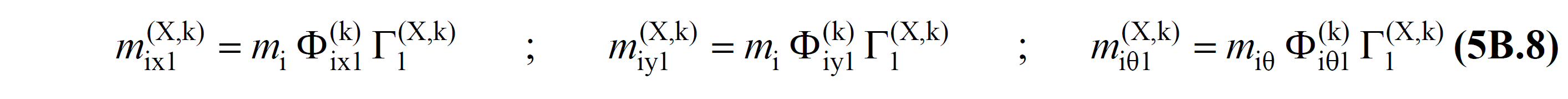TBDY Denklem 5B.8 'de verilen mix1(X,k), miy1(X,k) ve miθ1(X,k) değerleri, her bir k 'ıncı itme adımında, o adımda yenilenen serbest titreşim mod şekline bağlı olarak TBDY EK 4B 'de verilen Denklem 4B.2 'de hesaplanan etkin kütlelerin birinci mod (hakim mod) karşılığıdır. Φix1(k) , Φiy1(k) ve Φiθ1(k) değerleri, gözönüne alınan (X) deprem doğrultusunda, her bir k 'ıncı itme adımında plastik mafsalların meydana getirdiği rijitlik değişimi dikkate alınarak yapılan modal analiz sonucunda hesaplanan hakim mod şeklinin sırasıyla x,y,z eksenlerindeki genliğidir. Γ1(X,k) değeri gözönüne alınan (X) deprem doğrultusunda, her bir k 'ıncı itme adımında plastik mafsalların meydana getirdiği rijitlik değişimi dikkate alınarak yapılan modal analiz sonucunda hesaplanan modal katkı çarpanı 'dır. mi i 'nci katın toplam kütlesi, miθ i 'nci katın kütle eylemsizlik momenti olarak ifade edilir ve Tekil Düğüm Noktaları Kütleleri Tanımlanması (5.4.6) başlığında anlatıldığı şekli ile modellenir.