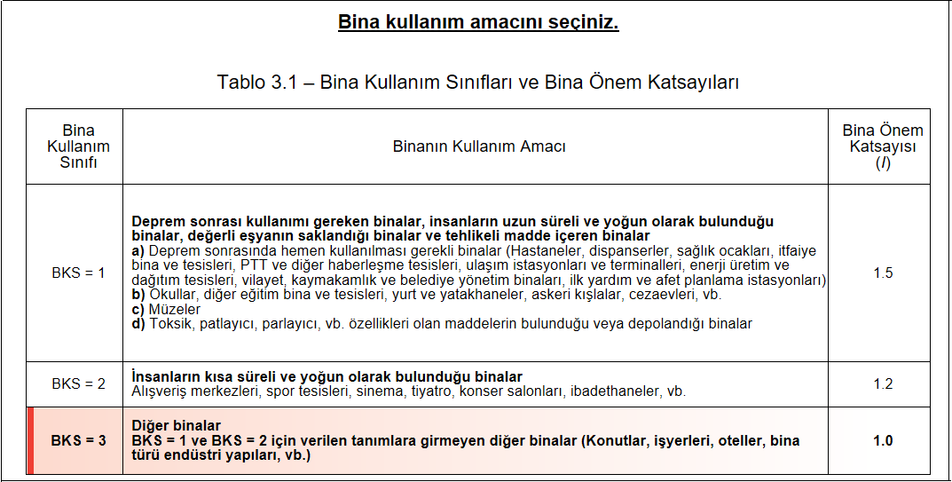 Tablo 3.1’e göre Bina Kullanım Sınıfı BKS=3 ve Bina Önem Katsayısı I=1 olarak belirlenir.