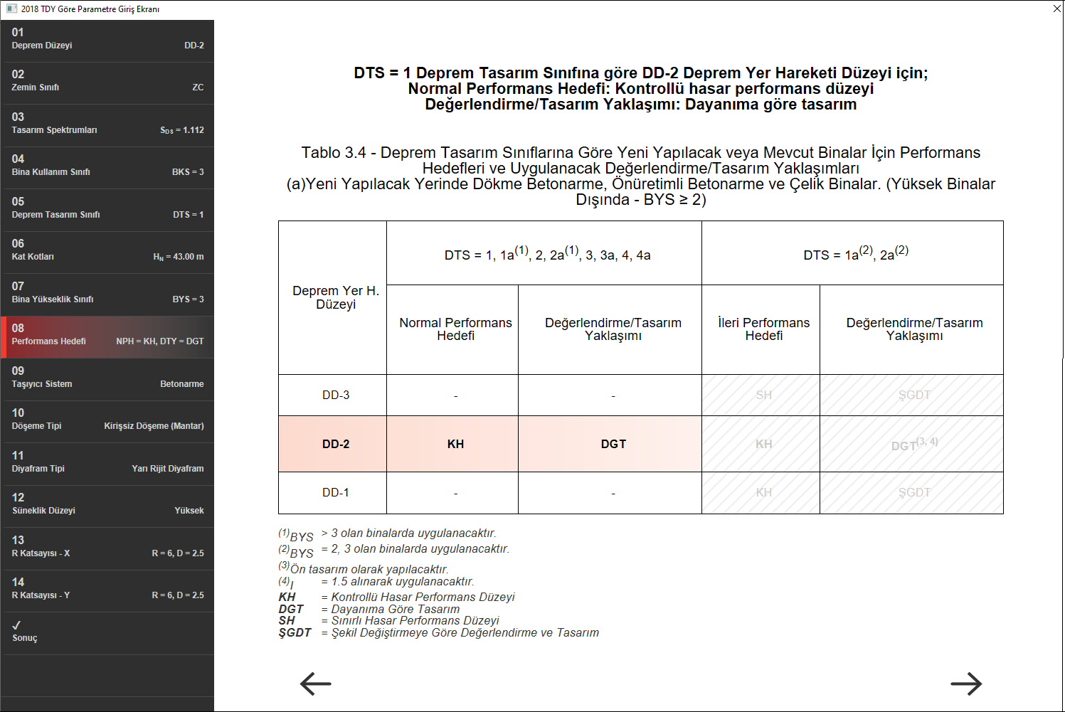 TBDY 2018 Tablo 3.4’e göre DD-2 deprem yer hareketi düzeyi için yerinde dökme betonarme binaların Kontrollü Hasar Performans Hedefi için Dayanıma Göre Tasarım yaklaşımı ile çözümü gerekir.