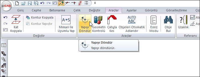 Araçlar menüsü altında yer alan Yapıyı Döndür komutunu kullanılarak yapınızı istediğiniz açıda döndürebilirsiniz.