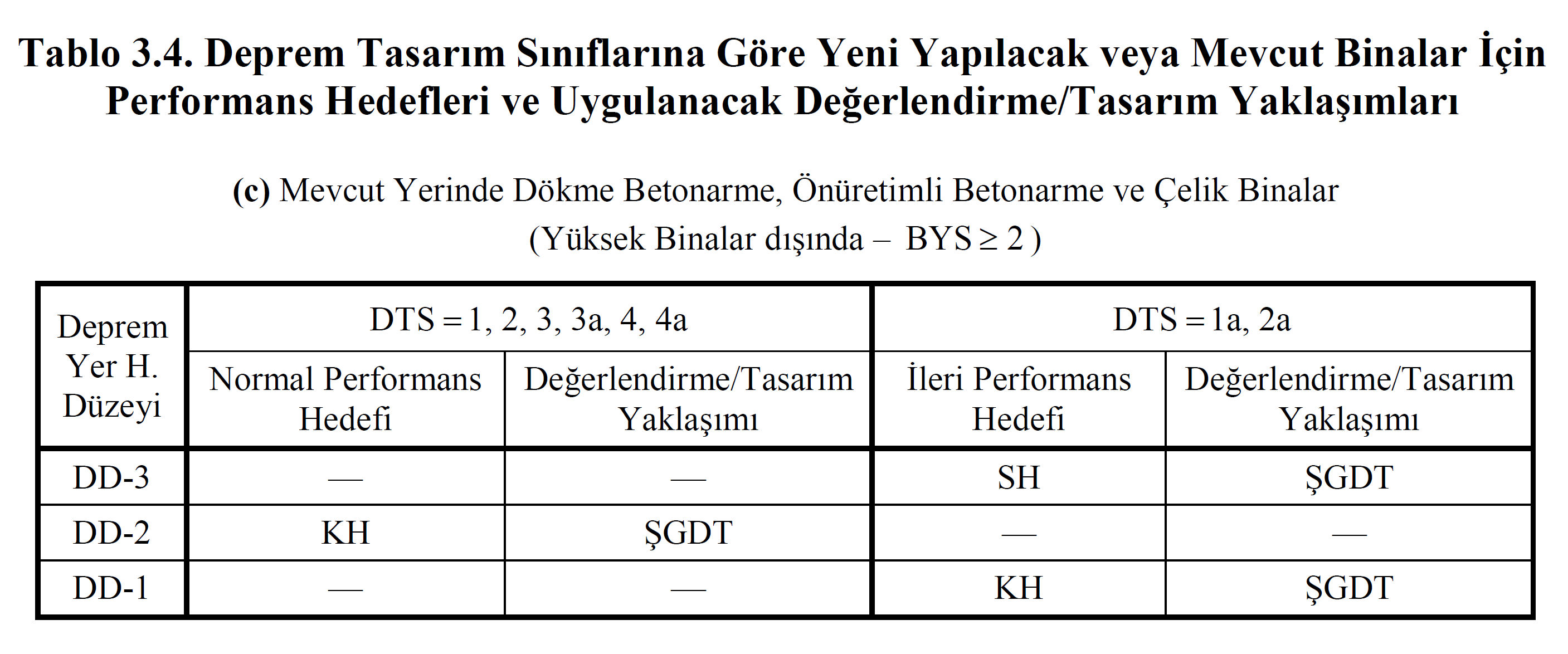 Yukarıdaki tabloya göre deprem tasarım sınıfı DTS=1, 2, 3, 3a, 4, 4a olan mevcut binalarda DD-2 deprem yer hareketi düzeyine göre ŞGDT yaklaşımı ile Kontrollü Hasar (KH) performans hedefi sağlanmalıdır. Deprem tasarım sınıfı DTS=1a, 2a olan mevcut binalarda DD-1 deprem yer hareketi düzeyine göre ŞGDT yaklaşımı ile Kontrollü Hasar (KH) performans hedefi ve DD-3 deprem yer hareketi düzeyine göre ŞGDT yaklaşımı ile Sınırlı Hasar (SH) performans hedefi sağlanmalıdır.