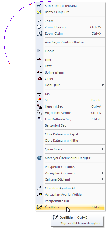 Yay - 3 Noktadan ve Yay (Merkez-Yarıçap-Açılar) komutu çalıştırıldıktan sonra ekrana gelen ilkel objeler yardımcı toolbarında Ayarlar ikonuna tıklayarak ulaşabilirsiniz.
