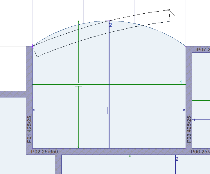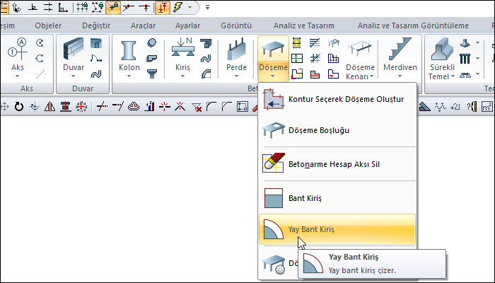 Yay Bant kiriş komutu ile tünel kalıp projelerinde boşta kalan perde uçlarında yay formunda konstrüktif kirişler oluşturulur. Yay bant kirişler analizde kullanılmazlar.