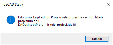 Projeyi kaydettikten sonra iskele projenize verilen isim ve bulunduğu klasör yolunu gösteren uyarı diyaloğu açılacaktır.