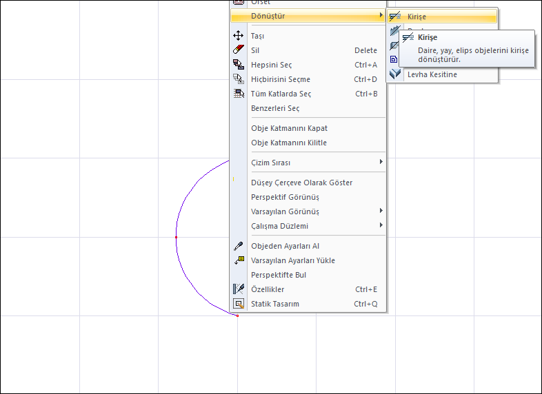 Yayı seçin ve farenin sağ tuşuna tıklayıp listeden Dönüştür/Kirişe satırını tıklayın.