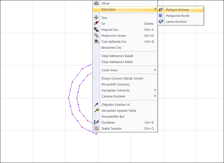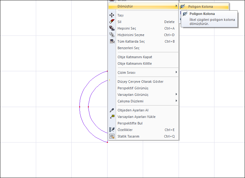 Çiziminizi seçip farenin sağ tuşuna tıklayın. Açılan listeden Dönüştür/Poligon Kolona satırını tıklayın.